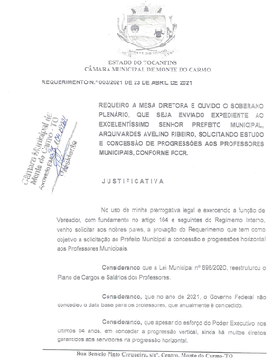 Em evento realizado no dia 16/08/2021, no Plenário da Câmara Municipal de Monte do Carmo/TO, do Poder Executivo Municipal e da Secretaria Municipal de Educação, para entrega de reformas na Secretaria de Educação, a assinatura de Decreto concedendo progressão horizontal aos professores, bem como a entrega de veículo para a referida Secretaria.